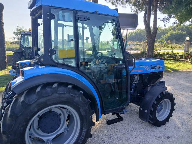 LANDINI mod: ADVANTAGE 75 V, motore PERKINS 4 cilindri, 75 hp, 40 km/h, cabina originale con ventilazione + riscaldamento no clima, gommato posteriore 90%, anteriore 70%, impianto freni ad olio 100 q.li, 5 distributori a doppio effetto, 2362 ore circa, cambio perfetto compreso inversore, macchina non sfruttata